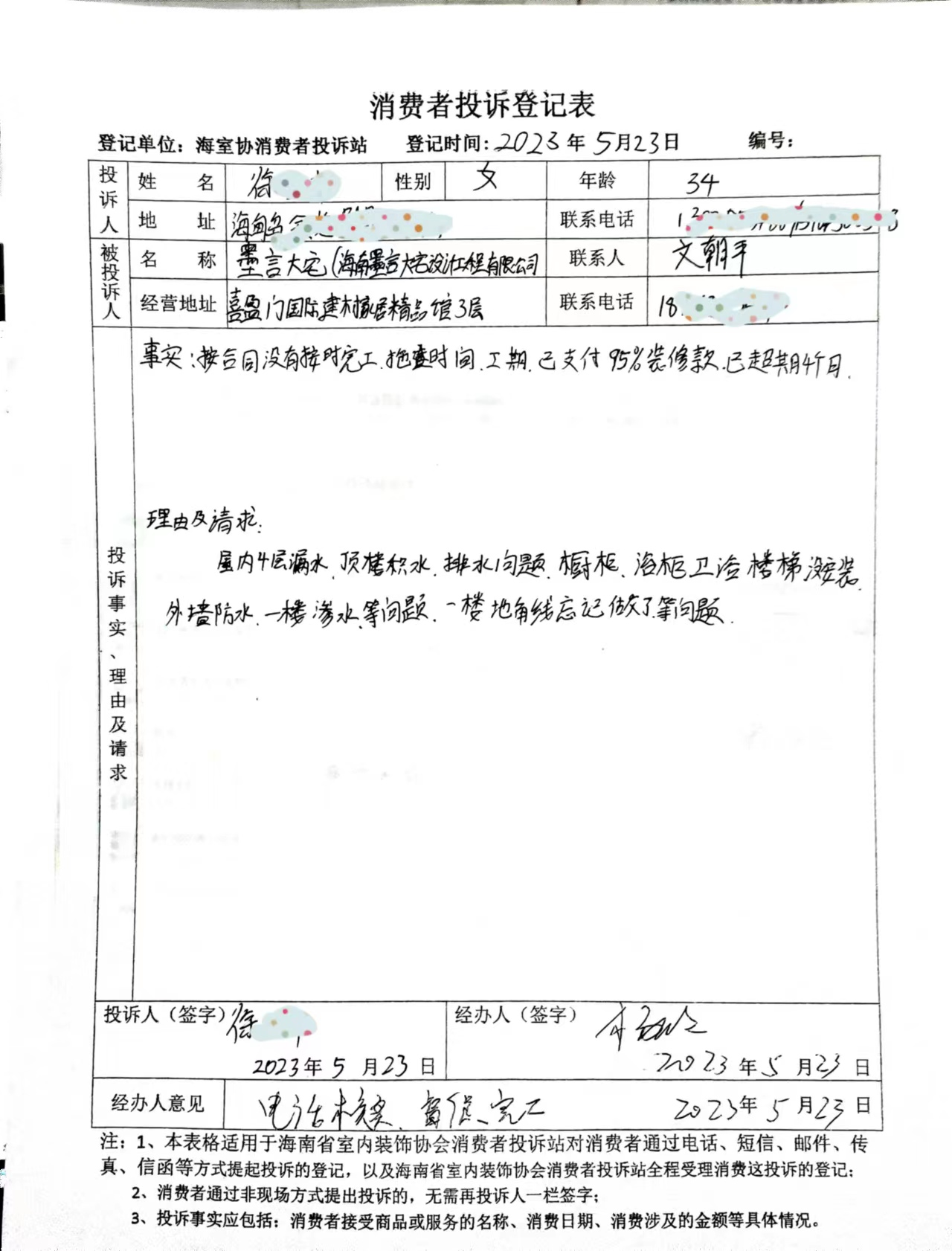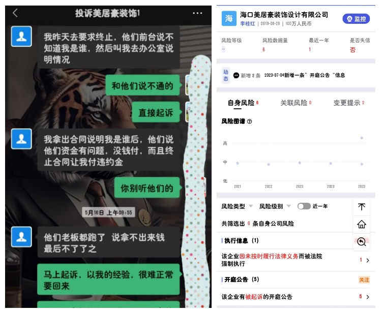 事由:目前收到该公司协会上门投诉2起,由媒体(直播海南栏目组)报送2起,电话咨询投诉3起。基本案件均是不能按期履约,业主申请退款后,迟迟不能退款,甚至在明知公司不具备履约能力的情况下,还在收业主的钱。据查,该公司利用电视媒体等宣传途径进行覆盖式宣传,通过价格优惠、家电赠送等方式吸引消费者,目前该公司已经不能正常运行,已涉及多起司法诉讼案件。提醒广大消费者、材料供应商、施工工人慎重选择与该公司合作;有合作纠纷的请做好证据保全,依法维权。