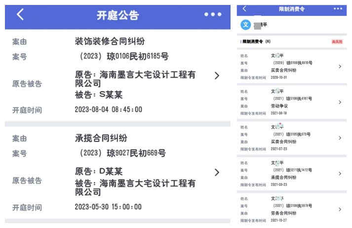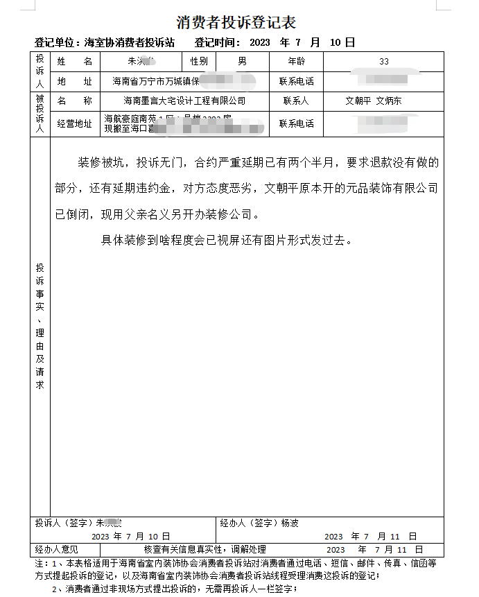 事由:该公司目前在协会收到上门投诉2起,电话投诉1起。基本案件均是以低价全包+家电赠送的噱头吸引消费者,然后在工程过半后要求增项,增项比例从40%-100%不等。因增项问题,业主不能接受的情况下,工程停工。根据业主方反应,该公司签订的合同中存在多处不合法/不合规的情况,合同缺失《工程报价单》《装修材料明细表》《工程项目增减项单》及房屋设计效果施工的各类图纸。据查,该公司实际控制人文*平在2018年成立海南元品装饰工程有限公司,该公司设计司法诉讼9起,有6起被限制消费令。2021年在某装饰公司任职期间,据该公司负责人反应,带走该公司大量客户,造成该公司重大经济损失。2021年成立海南墨言大宅设计工程有限公司,目前该公司设计司法诉讼2起,消费投诉3起,均为装修工程合同纠纷。对照以往该公司的一贯作为,以及社会尽调,该公司存在无资质运营、合同欺诈等违法违规行为,且屡教不改,严重损害行业声誉及消费者权益。在此,提醒广大消费者、材料供应商、施工工人慎重选择与该公司合作;有合作纠纷的请做好证据保全,依法维权。