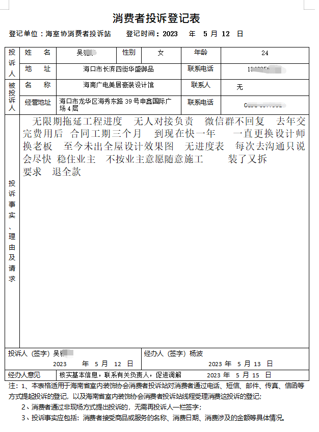 今年开年以来,随着疫情解封,市场复苏态势明显,全省装饰装修市场和建材销售数据都出现显著提升。在局面转好的情况下,也传出了很多不和谐的声音,据海南省室内装饰协会消费者投诉站数据,今年上半年,向协会反应(电话/邮件/上门)房屋建材、房屋装饰装修问题投诉达18件。针对消费者投诉主要反映的问题,进行说明警示,对个别情节严重的单位和个人进行公示警告。提醒广大消费者及时了解家装消费知识,提升生活消费品质;也提醒装饰行业从业人员注意合作风险和经营风险。从投诉信息中分析,消费者投诉的主要问题有:误导销售问题,部分装饰公司在营销时夸大优惠幅度吸引消费者,比如以远低于市场价格订“全包”装修套餐,误导消费者与商家签定不规范性合同;预付款不退问题,部分装饰公司口头承诺“预付款”“订金”不满意可全额退还,实际收据却写成“定金”,发生消费争议时退款难;装修合同签订和履行方面,不按照合同约定进行施工,装修过程中随意增加项目费用,不提供装修明细,存在乱收费的行为;建材送货方面,部分商家不能按照消费者在实体店所选购的建材型号、颜色送货,一旦发现与约定材质不符,要求退换货遭拒。