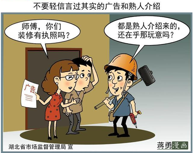 根据投诉案件的梳理,有部分消费者出于对朋友的信任,对装修公司情况不了解或者未签约等情况下就转款开工,后期出现问题后,导致财产受损/时间受损/友情受损。在考察装修公司时,必须查看施工单位的营业执照、资质等级证书;公司是否有固定办公场所;不要被样板工程所迷惑,最好到正在施工的现场看一看。尽量做好心中有数,避免上当受骗。