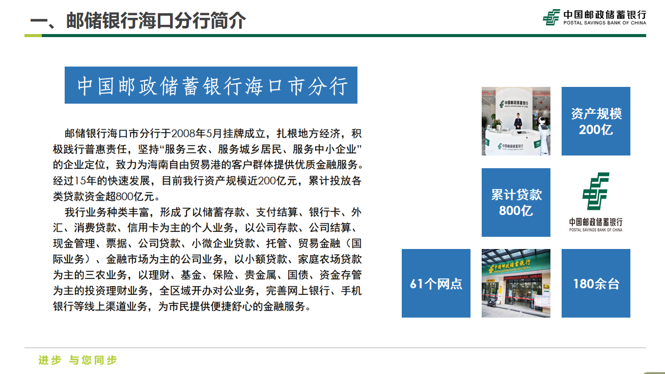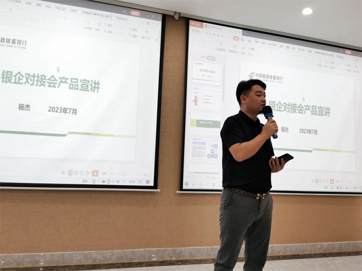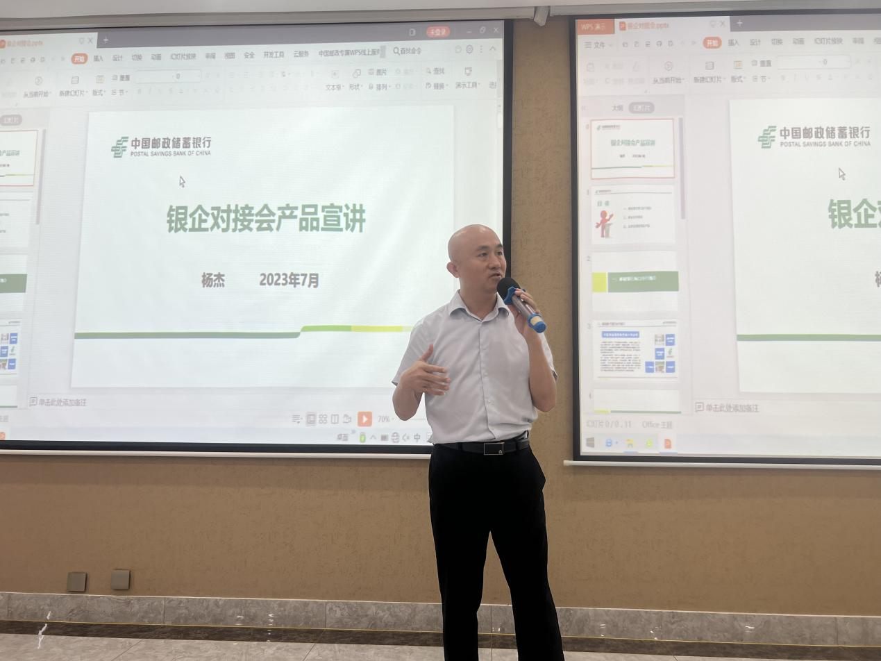 邮储银行海口市分行三农信贷部产品经理 杨杰为与会嘉宾介绍了邮储银行的历史,以及近期国家金融工作会议的最新方向。同时,根据行业实际情况,重点介绍了“银企对接方式、政府贴息政策、线上极速贷、创业担保贷、企业经营贷、个人消费贷”等多个政策和产品类型。