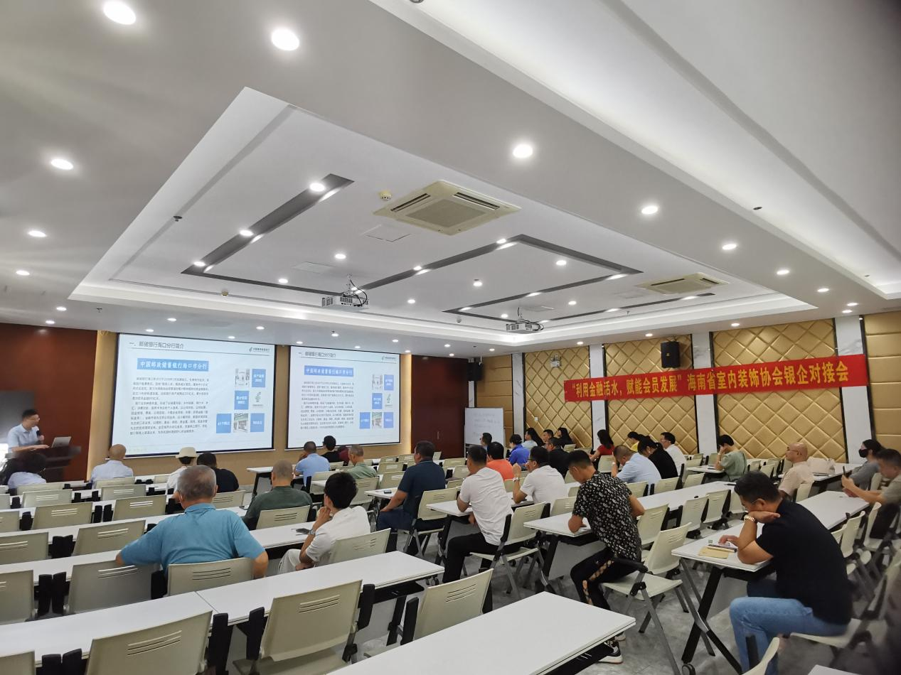 近些年来,因疫情和外部市场环境和政策变化的影响,海南省室内装饰行业受到了严峻的生存压力。在新的政策和发展形势下,海南省室内装饰行业面临新的机遇与挑战,协会为更好的赋能会员企业,2023年7月26日上午,协会联合邮储银行海口市分行在万佳家居装饰广场五楼会议室举行“利用金融活水,赋能会员发展”海南省室内装饰协会银企对接会活动。邮储银行海口市分行三农信贷部副总经理 云强、邮储银行海口市分行三农信贷部产品经理 杨杰、邮储银行海达路支行 支行长 吴茜出席此次活动;协会副秘书长杨波出席并主持该活动。协会各级会员约50家公司有关负责人出席活动。